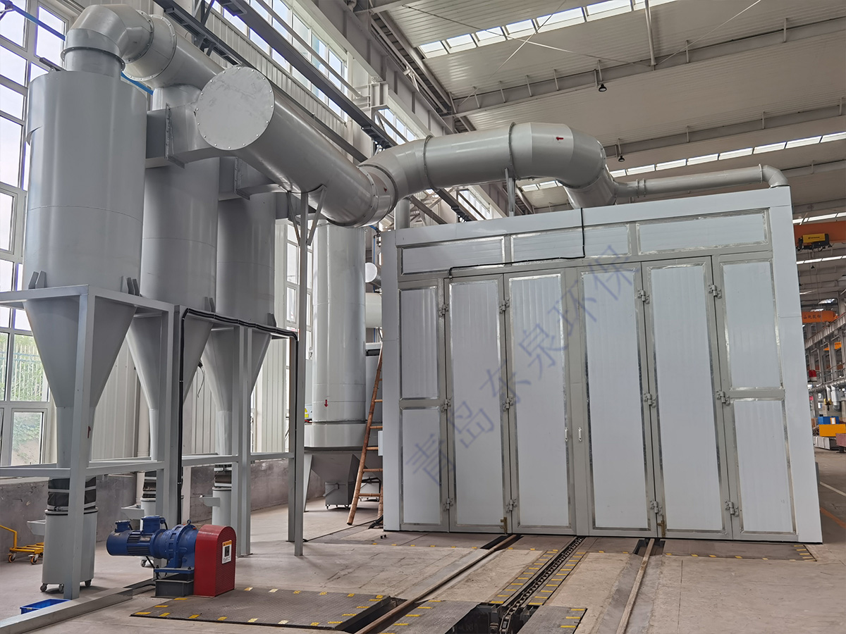 砂料回收、分离及除尘系统的工作原理:喷砂时砂料掉落到蜂窝漏斗里,再由气缸带动刮板往复运动,使落入漏斗内的砂料推送到喷砂房一端的螺旋输送机里面,通过螺旋输送机输送到皮带输送机内,皮带输送机等把砂料送入风选分离器中,风选分离器将砂料分离至储料斗,从而保持砂料的清洁度和纯度,有用的砂料进入储砂罐内继续循环使用,粉尘及污物则随气流进入除尘系统内,经过除尘系统的过滤、干净空气排入大气,粉尘及污物则储存在粉尘筒中等待定期清理。